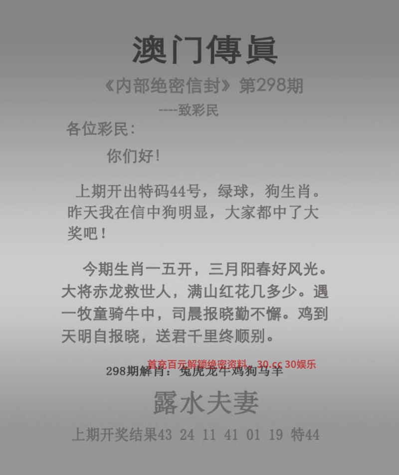 | 传真300期 今期生肖三三开,六七扬帆三四出。 蓝蓝绿绿中特期,曾说同人不同命。 西天路上寻特肖,琐窗风雨三二情。 六畜兴旺家中肖,强盗从来图谋利。 暗无天日 解:今期生肖三三开,解大数特码25-49,琐窗风雨三二情,解阴肖鼠龙蛇马狗猪。 无敌九肖:鼠马兔牛鸡蛇猪羊虎 |