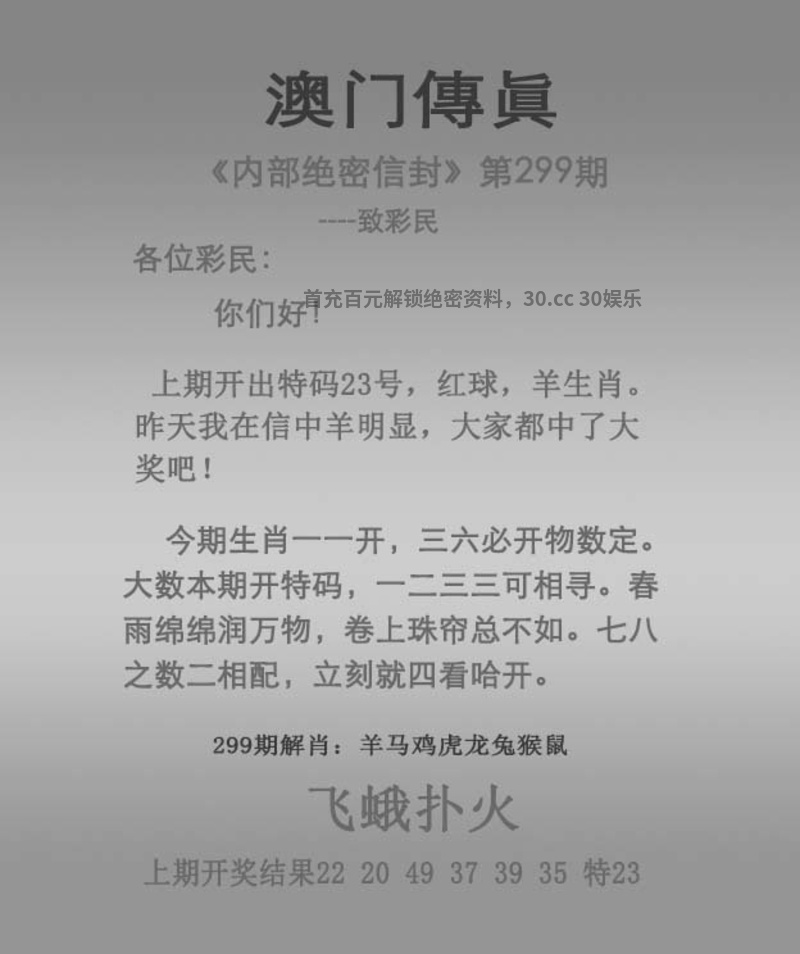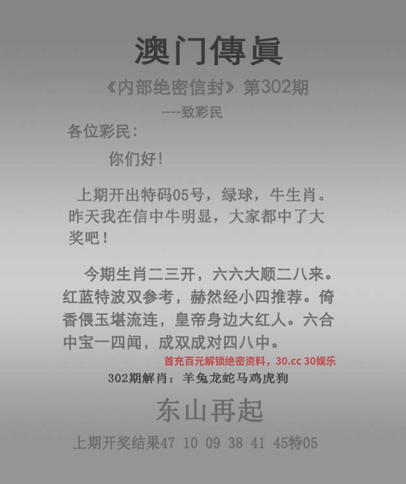 | 传真302期 今期生肖二三开,六六大顺二八来。 红蓝特波双参考,赫然经小四推荐。 倚香偎玉堪流连,皇帝身边大红人。 六合中宝一四闻,成双成对四八中。 东山再起 解:今期生肖二三开指23羊,六六大顺二八来指06鼠28虎,红蓝特波双参考指红波蓝波,成双成对四八中指双肖龙马猴虎鼠狗。 无敌九肖:羊龙马猴虎鼠狗鸡猪 |